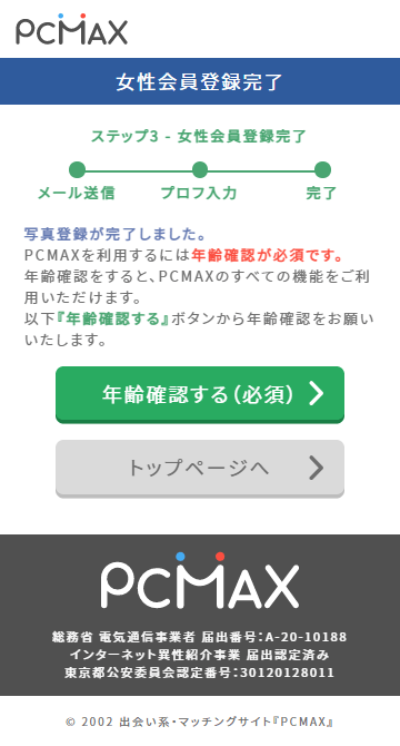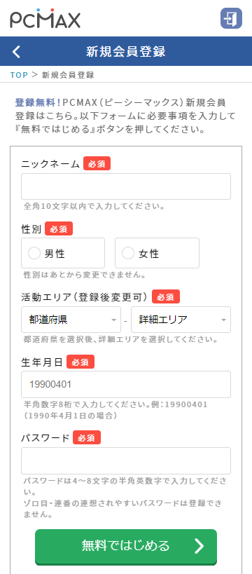 PCMAXにアクセスして『無料ではじめる』ボタンから登録フォームに進みます。