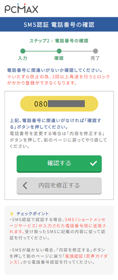 表示されている番号に間違いがないか確認し、「確認する」をクリックします。
