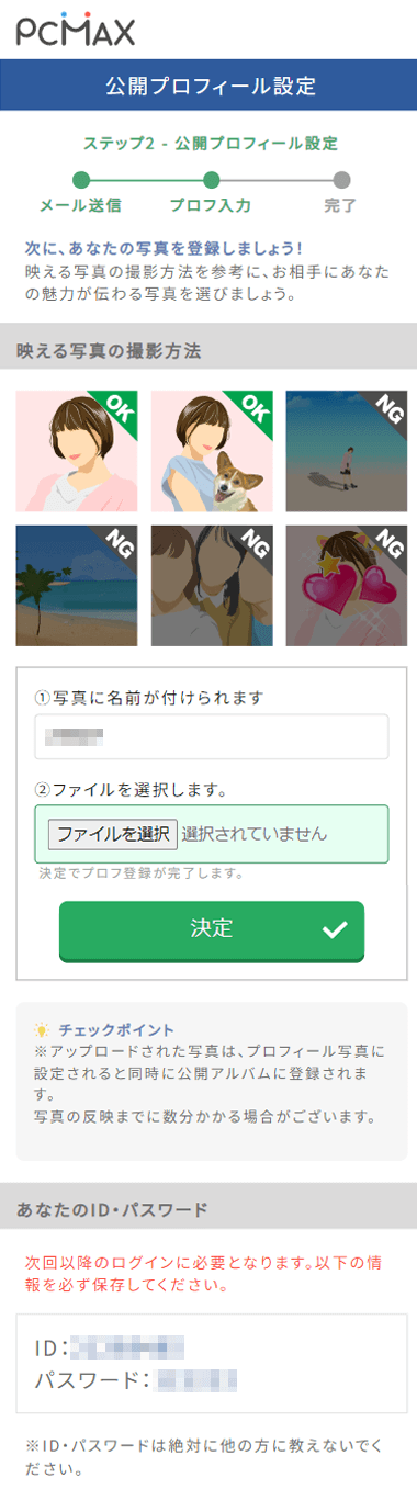 「ニックネーム」「性別」「活動エリア」「生年月日」「パスワード」の入力が完了したら『無料ではじめる』ボタンを押してください。